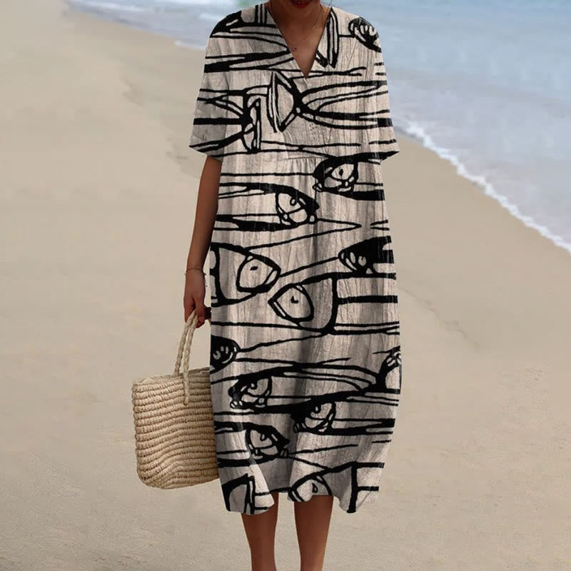 Dashingsoul Women's Ink Watercolor Sketch Drawing Fish Art Print Short-sleeved Midi Dress