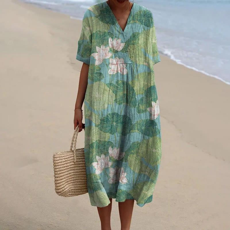 Dashingsoul Women's Vintage Lovely Lily Art Print Short-sleeved Midi Dress